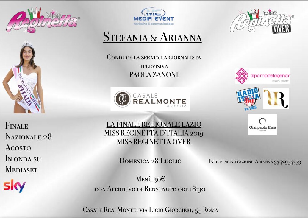 Nella splendida cornice di “Casale RealMonte” domenica 28 Luglio, si svolgerà la Finale Regionale Lazio di Miss Reginetta D’Italia e Miss Reginetta Over, una serata di grande glamour dedicata al fashion che vede a livello nazionale l’organizzazione da parte della New Meta Event con il direttore artistico Alessio Forgetta il quale, nel corso degli anni, ha scoperto moltissimi talenti.