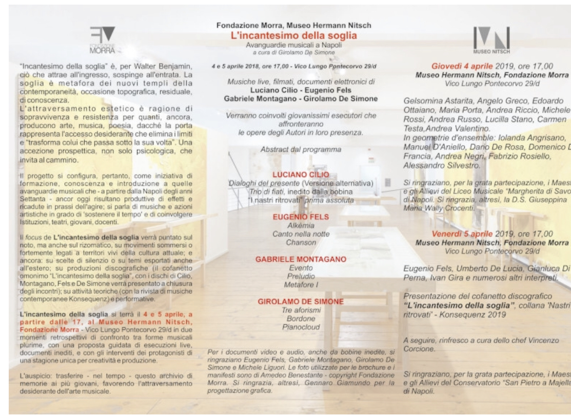 a cura di Girolamo De Simone4 e 5 aprile 2018, ore 17,00 – Vico Lungo Pontecorvo 29/d, Napoli“Incantesimo della soglia” è, per Walter Benjamin, ciò che attrae all’ingresso, sospinge all’entrata. La soglia è metafora dei nuovi templi della contemporaneità, occasione topografica, residuale, di conoscenza.L’attraversamento estetico è ragione di sopravvivenza e resistenza per quanti, ancora, producono arte, musica, poesia, dacché la porta rappresenta l’accesso desiderante che elimina i limiti e “trasforma colui che passa sotto la sua volta”. Una accezione prospettica, non solo psicologica, che invita al cammino.Il progetto si configura, pertanto, come iniziativa di formazione, conoscenza e introduzione a quelle avanguardie musicali che – a partire dalla Napoli degli anni Settanta – ancor oggi risultano produttive di effetti e ricadute in prassi dell’agire; si parla di musiche e azioni artistiche in grado di ‘sostenere il tempo’ e di coinvolgere Istituzioni, teatri, giovani, docenti.