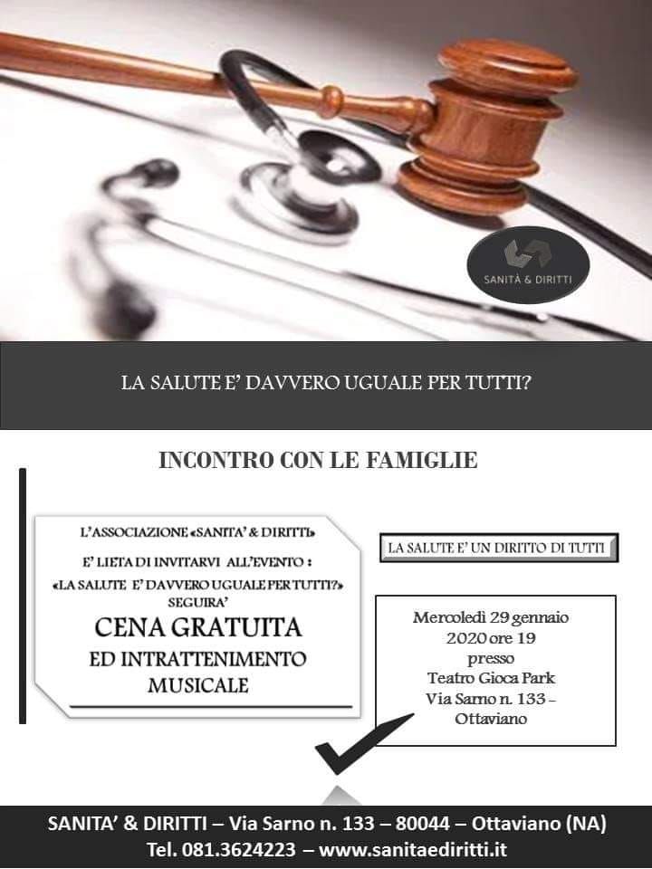 “Per discutere sul dibattuto tema: “La salute è davvero uguale per tutti?”, l’Associazione “Sanità & Diritti” ha organizzato un evento il 29 gennaio alle ore 19, presso il teatro Gioca Park sito in Ottaviano (NA) alla Via Sarno n. 133. L’evento è aperto a tutti e soprattutto alle famiglie. Al termine del dibattito seguirà una cena offerta dall’Associazione. Lo scopo è, appunto, sensibilizzare le famiglie e la popolazione tutta, sul diritto alla salute, facendo nascere in loro la consapevolezza che tale diritto fondamentale deve essere garantito e preteso. Non sono soli in questa battaglia, hanno il sostegno della mia associazione che, con l’apporto di avvocati, medici, professionisti, possiede i mezzi per aiutarli.”