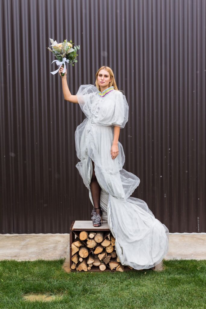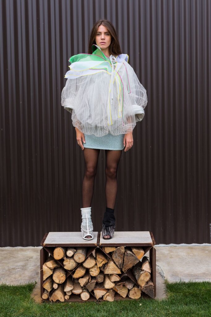 Trovare la miscela giusta tra filati leggeri e nobili, effetti chiffon trasparenti che fanno intravedere il corpo, ideare nuovi filati tecnici come il comune filo da pesca per rendere l’effetto rigido e classico dei balloon per creare volumi all’avanguardia;pizzi e rouches tridimensionali uniti a strutture tecniche come quelle delle sneakers danno vita ad un nuovo concetto di abiti che definiscono il corpo di chi li indossa, con spalle importanti e strutturate.