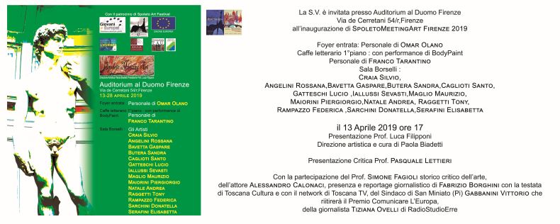 Bruxelles, Spoleto, Firenze, queste le ultime tappe di Spoleto Meeting Art l’evento artistico culturale patrocinato dall’Accademia AUGE, dalla Fondazione TAU e da Spoleto Art festival presidente Prof. Luca Filipponi, direzione artistica e cura di Paola Biadetti, inaugura il 13 aprile 2019 alle ore 17 presso l’Auditorium al Duomo in Via de Cerretani 54/r, con la  presentazione critica del Prof. Pasquale Lettieri. Al Foyer entrata: Personale di Omar Olano artista che negli anni 70 ha fatto parte del movimento dell’Arte Fantastica post Surrealismo, al Caffe letterario 1°piano, con performance di BodyPaint la personale “Astri nel tempo” di Franco Tarantino e, alla Sala Borselli : Craia Silvio maceratese l’artista “Formidabile” l’ultimo dei futuristi, con artisti che, hanno acquistato autorevolezza nel mondo dell’arte contemporanea sia italiana che estera, con il loro lavoro, con la  loro ricerca artistica e la loro storia: Angelini Rossana, Bavetta Gaspare, Butera Sandra, Caglioti Santo, Gatteschi Lucio ,Iallussi Sevasti, Maglio Maurizio, Maiorini  Piergiorgio,Natale Andrea, Raggetti Tony, Rampazzo Federica ,Sarchini Donatella,Serafini Elisabetta . Spoleto Meeting Art vuole essere uno stimolo a conoscerli e seguirli. Con la partecipazione all’inaugurazione del Prof. Simone Fagioli storico critico dell’arte, dell’attore Alessandro Calonaci, presenza e reportage giornalistico di Fabrizio Borghini con la testata di Toscana Cultura e con il network di Toscana TV, del Sindaco di San Miniato (Pi) Gabbanini Vittorio che ritirerà il Premio Comunicare L’Europa, della giornalista Tiziana Ovelli di RadioStudioErre.
